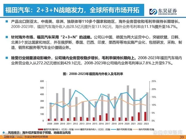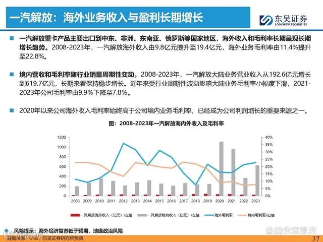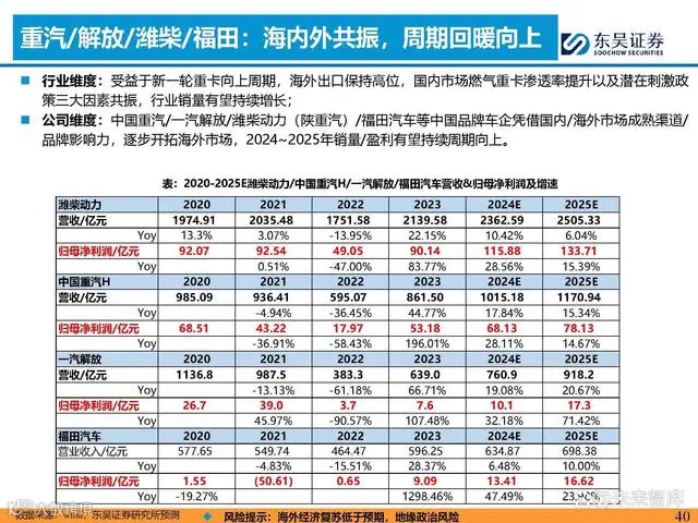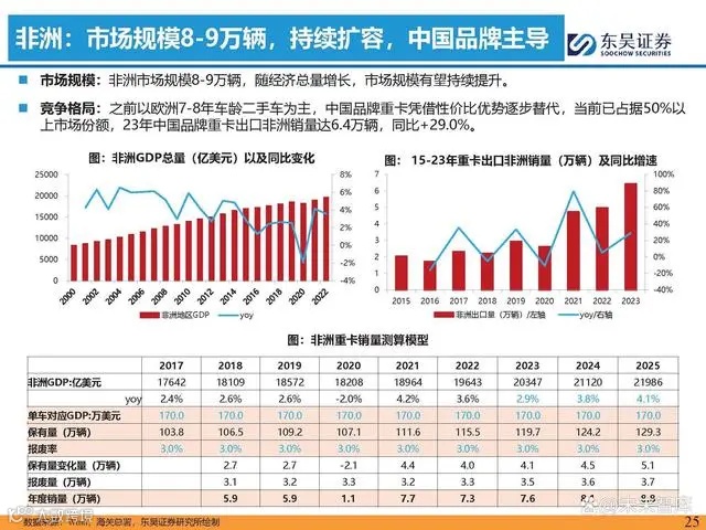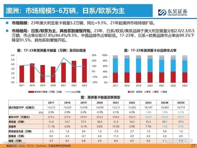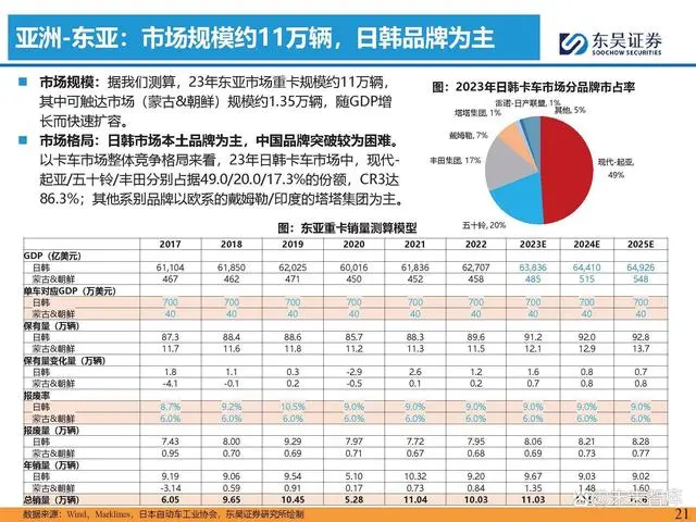 市场规模:据我们测算,23年东亚市场重卡规模约11万辆, 其中可触达市场(蒙古&朝鲜)规模约1.35万辆,随GDP增 长而快速扩容。市场格局:日韩市场本土品牌为主,中国品牌突破较为困难。以卡车市场整体竞争格局来看,23年日韩卡车市场中,现代起亚/五十铃/丰田分别占据49.0/20.0/17.3%的份额,CR3达 86.3%;其他系别品牌以欧系的戴姆勒/印度的塔塔集团为主。