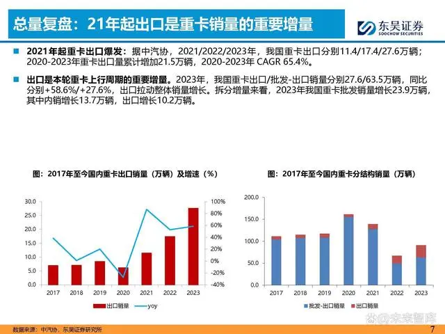 2021年起重卡出口爆发:据中汽协,2021/2022/2023年,我国重卡出口分别11.4/17.4/27.6万辆;2020-2023年重卡出口量累计增加21.5万辆,2020-2023年 CAGR 65.4%。