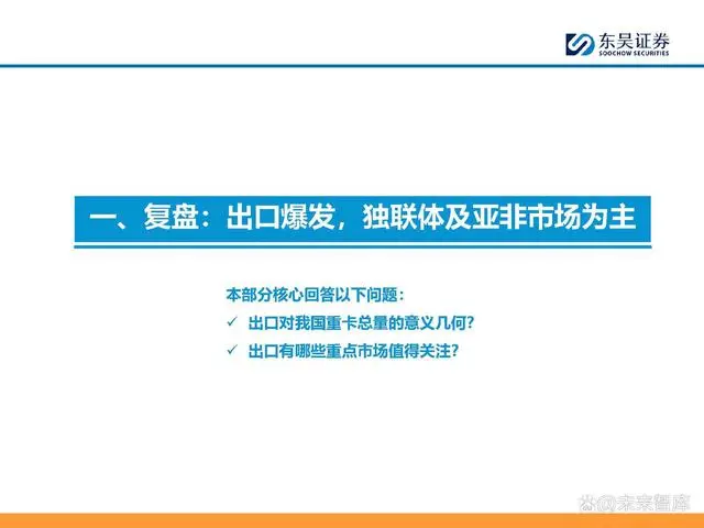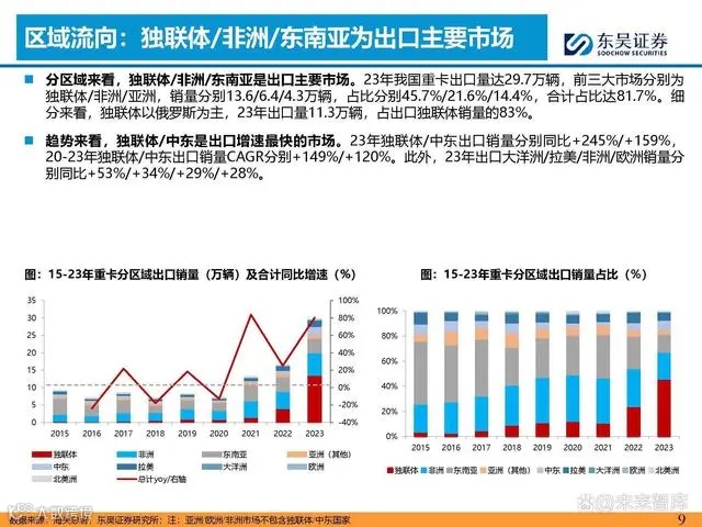 分区域来看,独联体/非洲/东南亚是出口主要市场。23年我国重卡出口量达29.7万辆,前三大市场分别为 独联体/非洲/亚洲,销量分别13.6/6.4/4.3万辆,占比分别45.7%/21.6%/14.4%,合计占比达81.7%。细 分来看,独联体以俄罗斯为主,23年出口量11.3万辆,占出口独联体销量的83%。