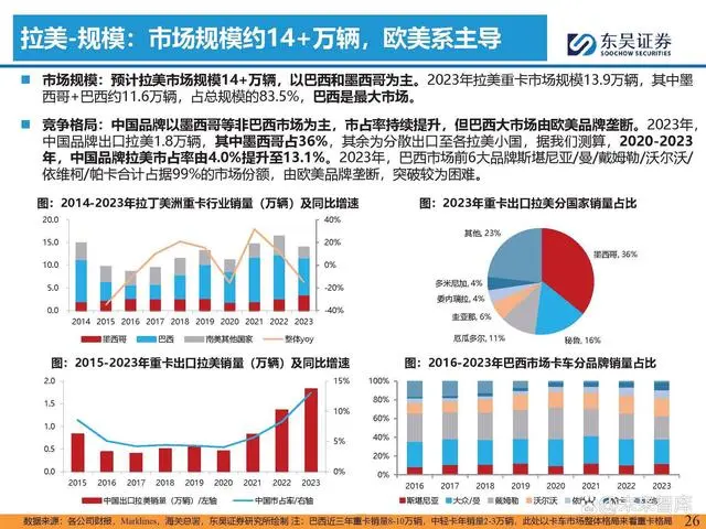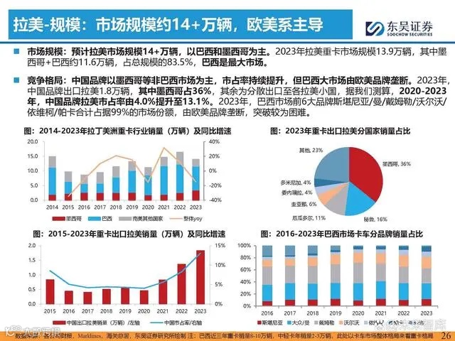 市场规模:预计拉美市场规模14+万辆,以巴西和墨西哥为主。2023年拉美重卡市场规模13.9万辆,其中墨 西哥+巴西约11.6万辆,占总规模的83.5%,巴西是最大市场。竞争格局:中国品牌以墨西哥等非巴西市场为主,市占率持续提升,但巴西大市场由欧美品牌垄断。2023年,中国品牌出口拉美1.8万辆,其中墨西哥占36%,其余为分散出口至各拉美小国,据我们测算,2020-2023 年,中国品牌拉美市占率由4.0%提升至13.1%。2023年,巴西市场前6大品牌斯堪尼亚/曼/戴姆勒/沃尔沃/ 依维柯/帕卡合计占据99%的市场份额,由欧美品牌垄断,突破较为困难。