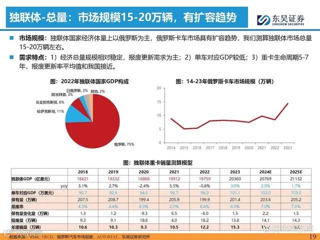 市场规模:独联体国家经济体量上以俄罗斯为主,俄罗斯卡车市场具有扩容趋势,我们测算独联体市场总量 15-20万辆左右。需求特点:1)经济总量规模相对稳定,报废更新需求为主;2)单车对应GDP较低;3)重卡生命周期5-7 年,报废更新率平均值和我国接近。