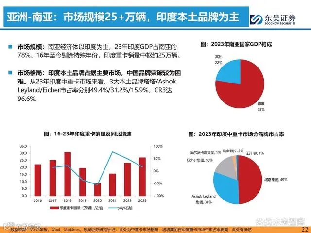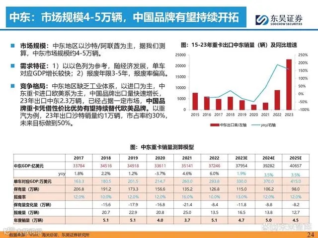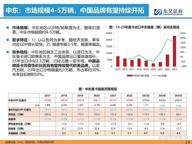 市场情况:按经济体量来看,东南亚市场中印尼规模最大,泰国/菲律宾/马来西亚等中小市场众多。据我们 测算,东南亚市场重卡规模约9万辆,随东南亚经济发展,市场将持续扩容。市场格局:日系/欧系品牌占据主要份额,国内自主重卡有望实现持续突破。23年国内自主重卡出口东南亚 4.3万辆。在高端产品中,国内重汽汕德卡产品价格跟日系品牌相当,但性能更为突出,中低端产品凭借性 价比优势远胜于日系竞品。