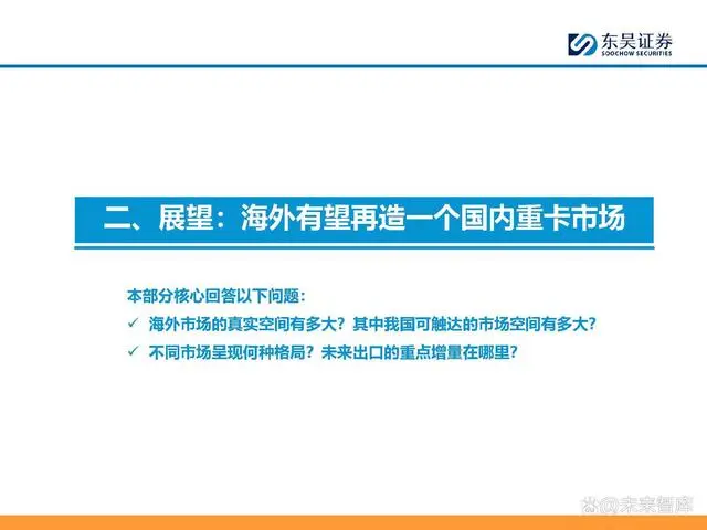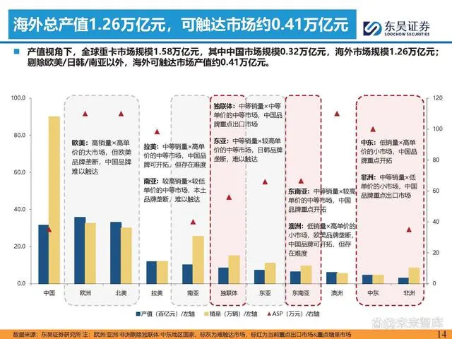 产值视角下,全球重卡市场规模1.58万亿元,其中中国市场规模0.32万亿元,海外市场规模1.26万亿元;剔除欧美/日韩/南亚以外,海外可触达市场产值约0.41万亿元。