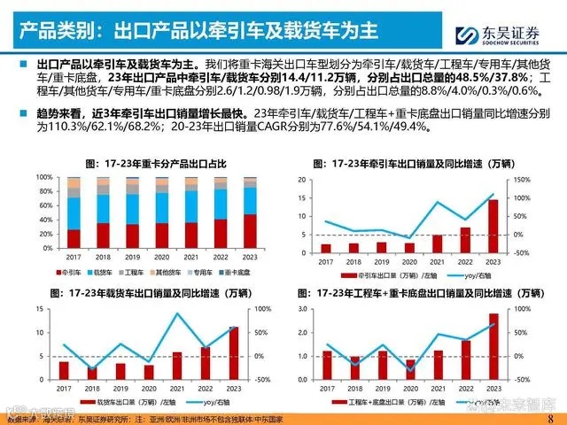 趋势来看,近3年牵引车出口销量增长最快。23年牵引车/载货车/工程车+重卡底盘出口销量同比增速分别 为110.3%/62.1%/68.2%;20-23年出口销量CAGR分别为77.6%/54.1%/49.4%。