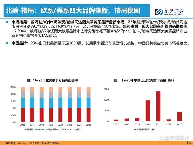 市场格局:戴姆勒/帕卡/沃尔沃/纳威司达四大欧美系品牌垄断市场。23年戴姆勒/帕卡/沃尔沃/纳威司达 市占率分别39.7%/29.6%/16.9%/13.7%,合计占据近100%市场。趋势来看,四大品牌垄断格局长期稳固, 16-23年,戴姆勒/沃尔沃两大欧系品牌市占率分别小幅下滑0.9/2.7pct,帕卡/纳威司达两大美系品牌市占 率分别小幅提升1.1/2.5pct。中国品牌:23年出口北美销量不足1000辆,长周期来看没有明显增长趋势,中国品牌突破北美市场难度大。