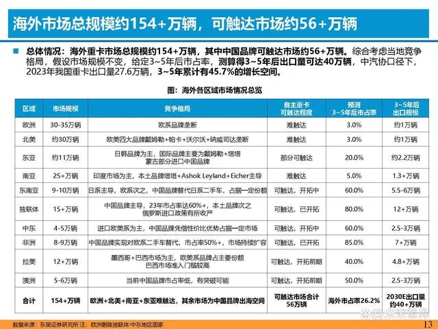 总体情况:海外重卡市场总规模约154+万辆,其中中国品牌可触达市场约56+万辆。综合考虑当地竞争 格局,假设市场规模不变,给定3~5年后市占率,测算得3~5年后出口量可达40万辆,中汽协口径下, 2023年我国重卡出口量27.6万辆,3~5年累计有45.7%的增长空间。