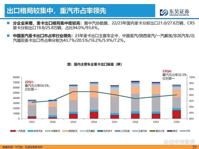 分企业来看,重卡出口格局集中度较高:据中汽协数据,22/23年国内重卡分别出口21.0/27.6万辆,CR5 重卡分别出口19.8/25.8万辆,占比94.0%/93.6%。中国重汽重卡出口市占率行业领先:23年重卡出口主要车企中,中国重汽/陕西重汽/一汽解放/东风汽车/北 汽福田重卡出口市占率分别为43.7%/20.5%/16.2%/5.9%/7.2%。