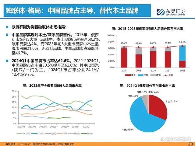 以俄罗斯为例看独联体市场格局:中国品牌实现对本土/欧系品牌替代。2015年,俄罗 斯市场前5大重卡品牌中,本土品牌市占率达60.2%, 欧系品牌达4%,而2023年前5大重卡品牌中本土品 牌市占率21.6%,无欧系品牌,中国品牌市占率跃升 至46.7%。2024Q1中国品牌市占率达62.6%。2022-2024Q1, 中国品牌市占率由30.5%提升至62.6%;其中以重汽 / 陕 汽 / 一汽为主 , 2024Q1 市 占 率 分 别 24.1%/ 12.4%/9.7%。