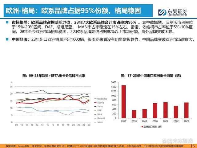 市场格局:欧系品牌占据垄断地位,23年7大欧系品牌合计市占率约95% 。其中戴姆勒、沃尔沃市占率位 于15%-20%区间,DAF、斯堪尼亚、 MAN市占率稳定在15%左右,雷诺、依维柯市占率位于5%-10%区 间。09年至今欧洲市场格局稳固,7大欧系品牌始终占据90%以上市场份额,海外品牌突破困难。中国品牌:23年出口欧洲销量不足1000辆,长周期来看没有明显增长趋势,中国品牌突破欧洲市场难度大。