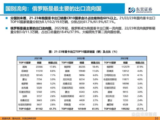 俄罗斯是最主要的出口流向国。2022年起,俄罗斯成为我国重卡出口第一流向国,22/23年流向俄罗斯销 量分别3.0/11.3万辆,占出口总量的18.4%/37.9%,大幅领先于第二流向国份额。