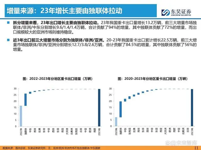 拆分增量来看,23年出口增长主要由独联体拉动。23年我国重卡出口量增长13.2万辆,前三大增量市场独 联体/非洲/中东分别增长9.6/1.4/1.4万辆,合计贡献了94%的增量,其中独联体贡献了72%的增量,而出 口规模较大的亚洲市场则维持稳定。