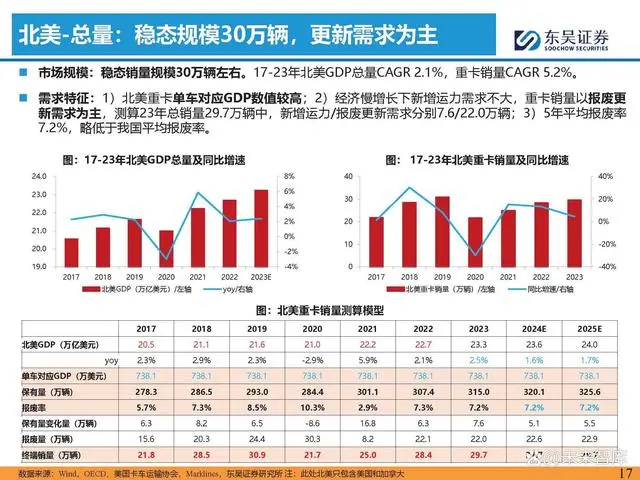 市场规模:稳态销量规模30万辆左右。17-23年北美GDP总量CAGR 2.1%,重卡销量CAGR 5.2%。需求特征:1)北美重卡单车对应GDP数值较高;2)经济慢增长下新增运力需求不大,重卡销量以报废更 新需求为主,测算23年总销量29.7万辆中,新增运力/报废更新需求分别7.6/22.0万辆;3)5年平均报废率 7.2%,略低于我国平均报废率。
