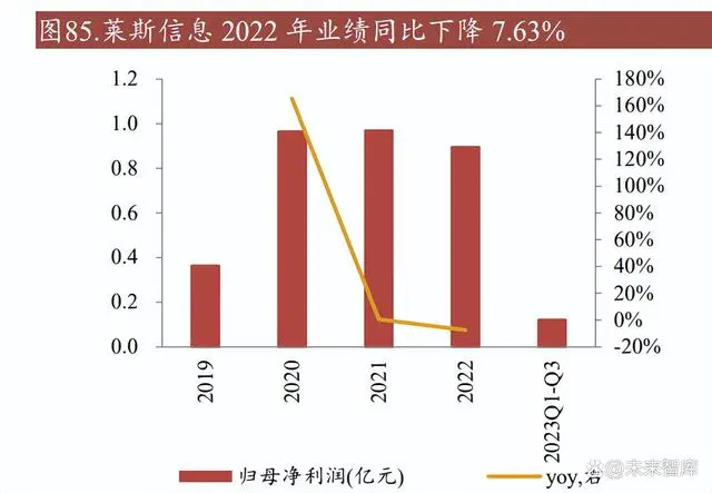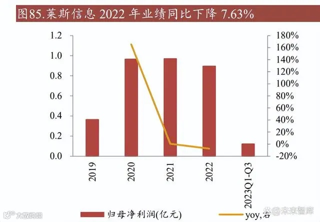 营收波动增长,盈利能力波动明显。莱斯信息整体营收呈波动增长趋势,受疫情 及宏观经济影响导致项目验收减少,2022 年营收同比下降 2.65%,2023 年 Q1-Q3 随着宏观修复及莱斯信息业务结构优化,同比提高 14.76%。从营收结构看,莱斯 信息主营业务为系统开发建设,营收占比约 90%。主要产品为民用指挥系统,占 比 86.66%,其中空管系统占总营收的 30.35%,为重点发展项目。从盈利能力看, 莱斯信息整体毛利率和 ROE 波动明显,主要由于采用终验法一次性确认项目收入,不同项目的毛利率差异较大。2019-2021 年毛利率下滑明显,系大额项目施工 难度大,成本过高所致。2022 年大额项目工程简单,毛利率回升。2023 年 Q1-Q3 毛利率下滑,主要因为高毛利率大项目集中在下半年确认收入。ROE 随业绩波动, 2020 年出现显著拉升系当年净利润规模大幅增加所致。