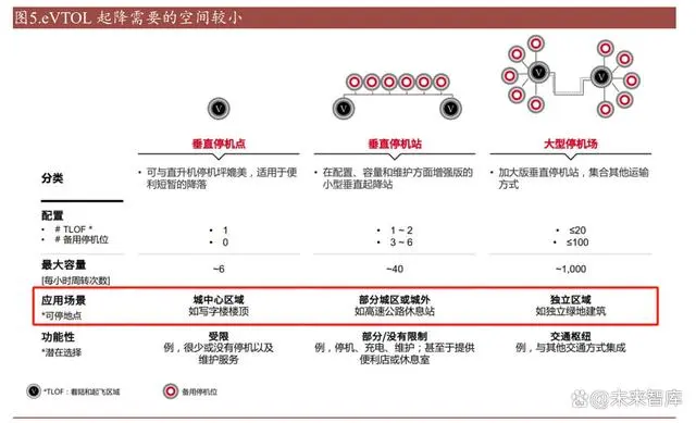 eVTOL 起降需要空间较小,无需大范围修建。根据土地面积大小、所处地段、匹 配功能等因素的差异,垂直起降场地主要可分为三种:垂直停机点、垂直停机站、 大型停机场。分别可选用写字楼楼顶(类似直升机)、高速公路休息站、独立停 机场。在多数情况下,只需要小范围补充基础设施,无需大规模另行修建机场。