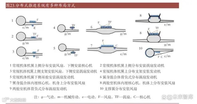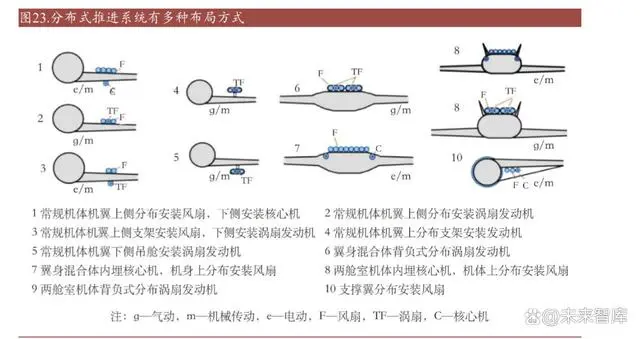 电动飞行器动力系统主要包括螺旋桨、电机、电机控制器及电池组模块。电机的 作用一方面推动旋翼转动使 eVTOL 实现起降和航行,另外需要通过电机引导电 动推进系统,以及驱动控制飞机航向和姿态。电机需要具备高功率密度性能以便 控制整机重量且不影响空气动力学设计,同时需要适应高低温、湿热等环境,且 需要较高安全性。eVTOL 的动力系统采用分布式推进技术 DEP(Distributed Electric Propulsion)。DEP 系统利用多个推进器作为飞机的动力装置,可以用三倍于传统大发动机的效 率达成和直升机相同的推力,且动力冗余设计使得飞行器更加安全。另外, DEP 系统可在飞机的六个维度产生力和力矩并实施控制,机身的结构损坏或传统控制 面的丧失对飞机生存能力的影响较小。分布式推进系统有常规机体(CAF)、两舱室 机体(DBF) 、混合翼体(HWB) 和支撑翼(SBW)等 4 种基本飞机布局,结合不同推 进器布局,可以推导出 20 种发动机布局。