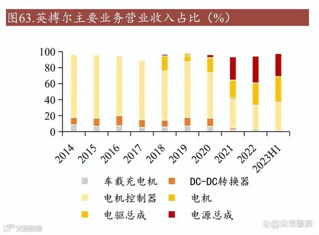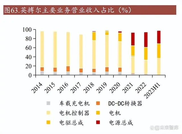 新能源汽车业务领先,营收稳健增长。英博尔主营业务聚焦于新能源汽车核心部 件,包括驱动总成、电源总成及关键动力系统组件。2022 年,英博尔电机控制器 业务营业收入占比达 35.34%,电驱总成与电源总成业务亦分别贡献 22.36%和 28.91%的营收。其中,电机控制器业务以 5.77 亿元的营业收入位列首位,毛利率 23.76%。在新能源乘用车市场,英博尔驱动总成、电机控制器及车载电源产品销 量均居行业前列。2022 年,驱动总成销量达到 37.42 万台套,市占率达 5.37%。在电源总成领域,英博尔产品销量达到 56.41 万台套,市占率高达 8.6%,稳居国 内第三。英博尔在专用车及工程机械电动化领域与多家龙头企业达成战略合作, 实现业务的快速增长。