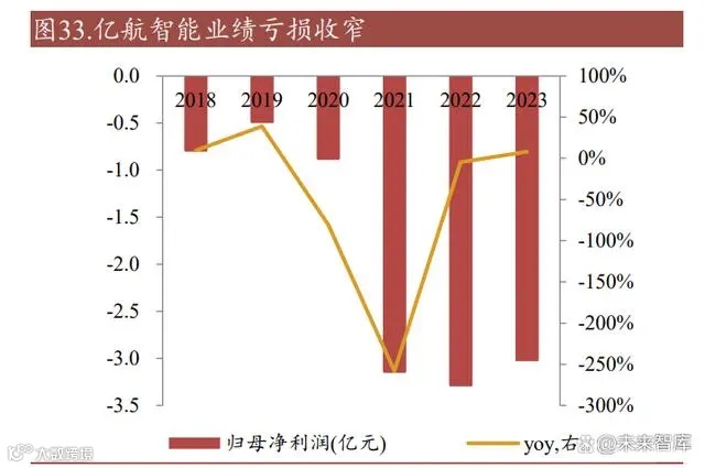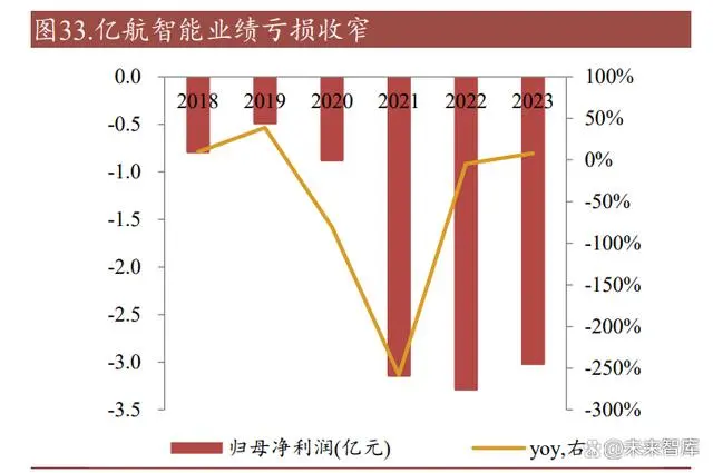 业绩亏损收窄,毛利率提升显著。亿航智能的收入来源主要为空中交通解决方案 以及从 2019 年开始陆续交付的 EH216 系列 AVV,截至 2022 年底亿航智能累计 交付 185 台。由于未取得适航证不能进行商业运营,且境外订单在交付时已确认收入,亿航智能 2021 年、2022 年收入来源为国内旅游景点试验、测试、培训,此 两年营收分别同比下降 68.46%和 21.99%,业绩亏损加大。亿航智能 2023 年第四 季度 EH216-S 取得适航证,带动全年营收同比增加 164.97%,亏损有所收窄。亿 航智能近年来毛利率维持在 60%以上,在无人驾驶 eVTOL 领域拥有较强的定价 权。