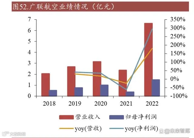 广联航空营收规模稳步增长,各项业务毛利率在高位维持稳定;2018 年到 2022 年,广联航空总营收从 2.06 亿增长至 6.64 亿,CAGR 高达 33.99%,2021 年营收 与净利润较低系哈尔滨受多轮疫情的影响,使部分产品验收工作无法如期进行, 收入确认无法在 2021 年内实现所致;从营收结构来看,航空航天零部件与无人机 的生产与销售是广联航空的主要经济来源,在 2022 年,该业务贡献了将近 80%的 收入;在盈利能力方面,广联航空各项业务的毛利率指标都表现良好,航空航天 零部件及无人机与航空辅助工具的毛利率都基本维持在 40%以上。