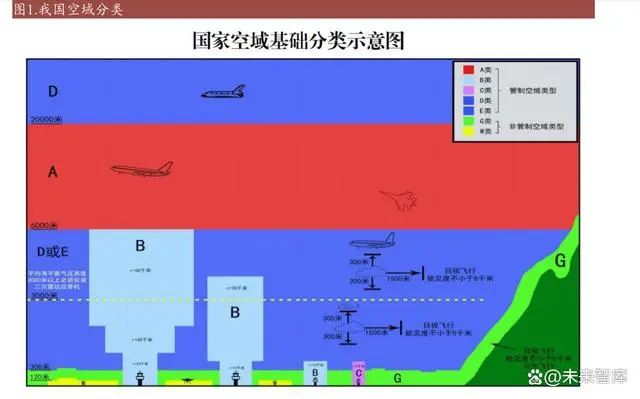 我国城市低空交通受到严格的监管,由中国民用航空局统一负责民用飞行器的管 理和空域划分。根据《国家空域基础分类方法》,空域被细分为 A 至 W 共七类, 其中 A 至 E 类为管制空域,G、W 类则为非管制空域。管制空域主要服务于有人 驾驶的飞行器,如民航飞机,在特定情况下也支持长航时或高空科研用的无人机。民航客机通常在 3,000 米以上的管制空域巡航,由空中交通管控中心统一调配。