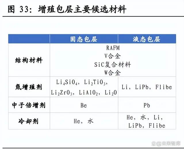 未来包层模块将升级为增殖包层(Breeder Blanket,BB),相比之前加 入了产氚功能。该功能由增殖单元(BreederUnits,BU)实现,由产物 中子和锂 6 发生反应而产氚。氚增殖剂、中子倍增剂、冷却结构是增殖 单元的三个主要组成部分。氚增殖剂是含有锂的小球。中子倍增剂是能 使中子实现增殖的材料,主要是为了防止产物中子损耗导致的产氚效率 降低。同时,为了防止热量堆积,该模块还设置了冷却结构,主要采用 氦冷、水冷等方式降温散热。此外,增殖单元产生的氚并不能自动返回 聚变堆,需要通过配套系统中的氚工厂来进一步处理。