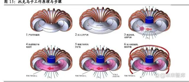 托卡马克的工作原理可以分为四个步骤:获得等离子体、持续加热至高温、发生聚变反应、实现自持燃烧。1)获得等离子体:在氘、氚燃料进 入装置后,首先利用磁场生成的电场击穿燃料,将氘氚原子核的核外电 子剥离,使其成为含原子核、电子的等离子体。2)持续加热至高温:利 用中央螺线管的欧姆加热将真空室内温度加热至 2000 万度,再利用辅 助加热系统加热,最终达到约 1 亿度的高温条件。3)发生聚变反应:用 磁场对等离子体产生约束,使之悬空高速旋转,在高温条件下持续反应。4)实现自持燃烧:反应后,产物α粒子由于带正电,能够被约束在等离 子体内,并继续为等离子体加热。产物中子不带电,无法受到约束,将 轰击内壁中的锂而产氚。这时,再通过燃料系统注入氘,并不断为磁体 系统的线圈通电。至此,高温、磁场、原料再次兼备,反应周而复始。