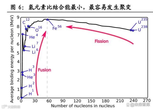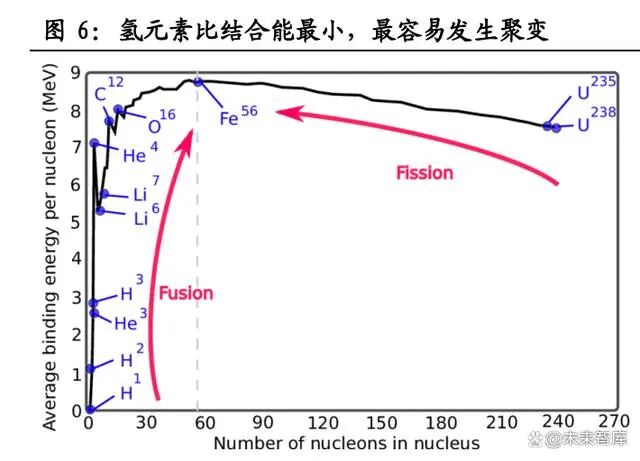 可控核聚变以氢为原料,原因在于氢的比结合能最小,核内质子、中子 结合得最不牢固,越容易与其他原子核结合。氢的同位素有氕 H、氘 D、 氚 T,在众多组合中,氘氚聚变(DT 聚变)反应截面最大,能够发生反 应的范围最大,所需促使原子核结合的外力(加热、加压)最小,反应 难度最小,因此是目前最为主流的技术路线。氘氚燃料的获取较为容易。其中,氘可通过电解重水得到,可供人类使 用百亿年。氚虽然在自然界中总量少且分散,但可在聚变堆内用中子轰 击锂 6 产生。