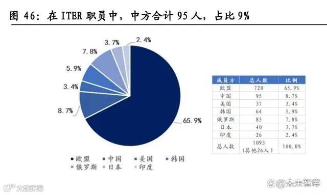 截至 2023 年 7 月,ITER 正式员工总数 1093 人。中方在 ITER 组织中 正式职员 95 人,占职员总数的 8.7%,仅次于欧洲。