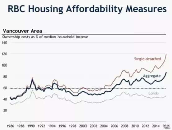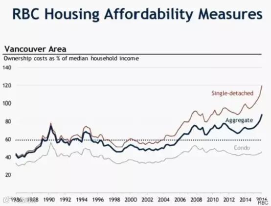 RBC的数据显示,温哥华地区独立屋的可负担水平已经远远超过了家庭收入。
