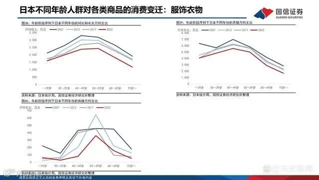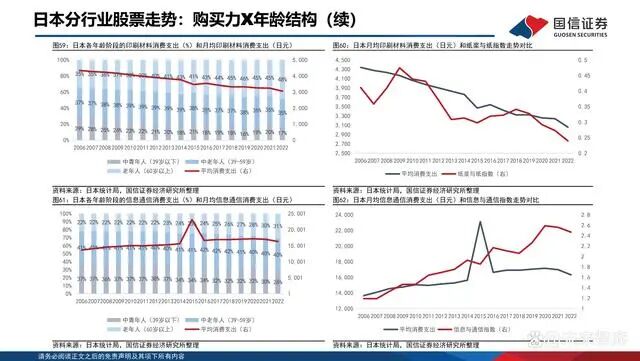 从历史数据可以看出,大部分商品的消费情况与行业指数相对走势高度相关:例如近年来食品、家具以及医疗保健的月平均消费支出整体呈上升态势,食品指数、电器指数以及精密仪器指数也不断走强;月均印刷材料消费支出的不断萎缩也与纸指数的不断走低相对应。商品消费群体的年龄结构改变会影响该商品的消费倾向,进而影响行业指数的相对走势。中老年消费属性:酒类、和服、药物、营养品、健康服务、交通支出、通信支出;中青年消费属性:房租、西服、保健医疗和器具、娱乐项目。近15年来,医疗保健用品消费者中中老年人占比显著上升,中青年和老年消费者比重相对下降。中老年人消费能力和消费意愿较高,推动医疗保健月均消费支出的快速上涨,带动精密仪器指数的大幅走强。信息通信类产品消费者中中青年人占比明显下降,老年人比重显著上升,弥补了空缺。老年人的消费能力强于中青年人,推动信息通信类产品月均消费支出的快速上涨。与此同时,信息与通信指数整体也有小幅提高。互联网和电子计算机的快速发展严重挤压了纸质印刷品的市场需求,中青年人对新事物的接受度较高,其占印刷材料消费支出的比重下降最为明显,相应的中老年人和老年人的占比相对提高。但总体市场对印刷材料的需求减少导致日本月均印刷材料消费支出不断下降,在股票市场上表现为纸指数的持续走低。