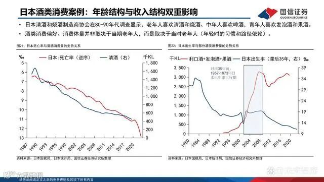 日本清酒和烧酒制造商协会在80-90年代调查显示,老年人喜欢清酒和烧酒、中年人喜欢啤酒,青年人喜欢发泡酒和果酒。酒类消费偏好、消费体量并非取决于当期老年人,而是取决于当时老年人(年轻时的习惯和路径依赖)。