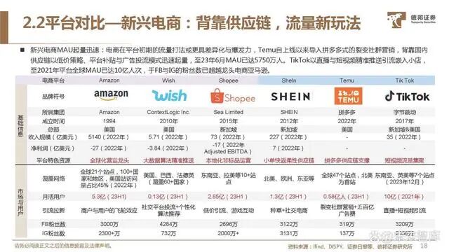 新兴电商MAU起量迅速:电商在平台初期的流量打法或更具差异化与爆发力,Temu自上线以来导入拼多多式的裂变社群营销,背靠国内 供应链以低价策略、平台补贴与广告投流模式迅速起量,至23年6月MAU已达5750万人。TikTok以直播与短视频精准推送引流嵌入小店, 至2021年平台全球MAU已达10亿人次,于FB与IG的粉丝数已超越龙头电商亚马逊。