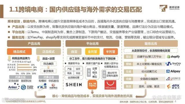 降本提效,联接内外。跨境电商以提升交易效率降低成本为目的,连接海内外优质供应链与消费需求,完成进出口贸易流通。产品出海:以安克创新为例,背靠优质供应链向海外输出商品,根据铺货量、渠道策略、品牌打法分为泛品与精品模式。平台出海:以Temu、中国制造网为例,集合上游制造、下游用户触达、交易服务等全产业链管理,出口综合化运营能力。服务出海:如YiwuPay、shopify等支持完成跨境贸易环节中的支付、物流、仓储、营销等流程,输出细分领域专业服务。