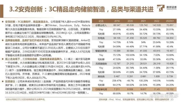 安克创新:3C出海标杆,精品智造龙头。公司连续7年入选BrandZ中国全球化 50强,在电子配件品类种排名第一,旗下Anker、Soundcore、Eufy、Nebula 等六大自主品牌覆盖充电类、智能创新与无线音频类产品,以亚马逊、天猫等电 商平台+自建站与线下门店覆盖全球销售网络。2023年Q1-Q3,公司实现营收/ 净利润117.9亿元/12.1亿元,同比增长23.6%/46.1%。
