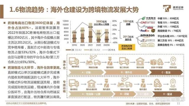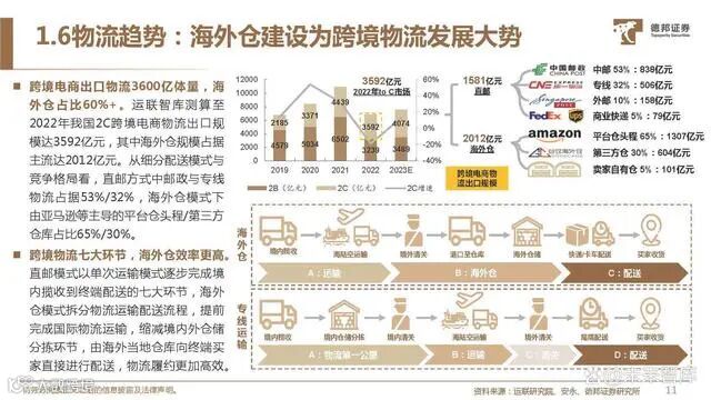 跨境电商出口物流3600亿体量,海 外仓占比60%+。运联智库测算至 2022年我国2C跨境电商物流出口规 模达3592亿元,其中海外仓规模占据 主流达2012亿元。从细分配送模式与 竞争格局看,直邮方式中邮政与专线 物流占据53%/32%,海外仓模式下 由亚马逊等主导的平台仓头程/第三方 仓库占比65%/30%。跨境物流七大环节,海外仓效率更高。直邮模式以单次运输模式逐步完成境 内揽收到终端配送的七大环节,海外 仓模式拆分物流运输配送流程,提前 完成国际物流运输,缩减境内外仓储 分拣环节,由海外当地仓库向终端买 家直接进行配送,物流履约更加高效。