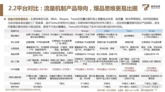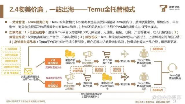 一站式管理,Temu服务出海:Temu全托管模式下仅需商家选品供货并运输至Temu国内仓,后期质量管控、零售定价、平台 销售、海外物流配送及售后等服务均有Temu承担,并针对不同品类与打法细分为VMI现货模式与JIT预售模式。卖家角度:1)低营运成本:进驻Temu平台仅需缴纳1000元保证金,无佣金、租金、仓储、广告等费用,准入门槛较低;2) 低营运难度:仅需负责前端生产备货,不参与管理;3)低议价权:Temu掌控实际定价权与产品打法,上游利润空间有所压缩;4)高流量与爆品率:Temu平台以性价比迅速拉新引流,用户规模与访问量增长迅速,流量机制倾向产品分配,爆品率更高。