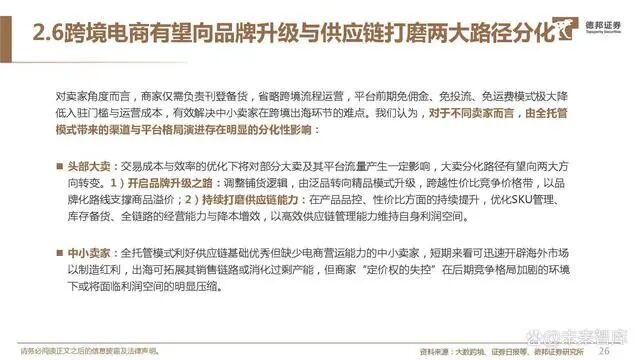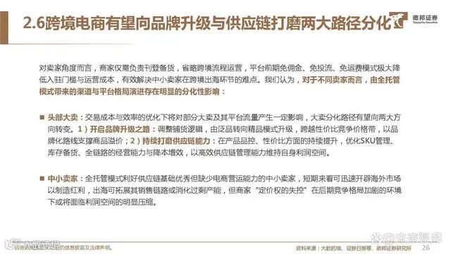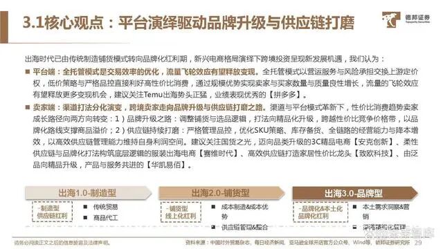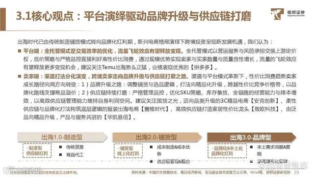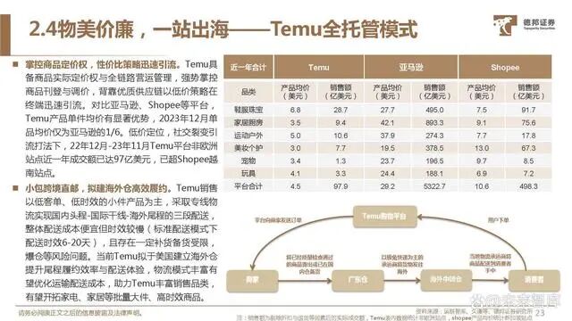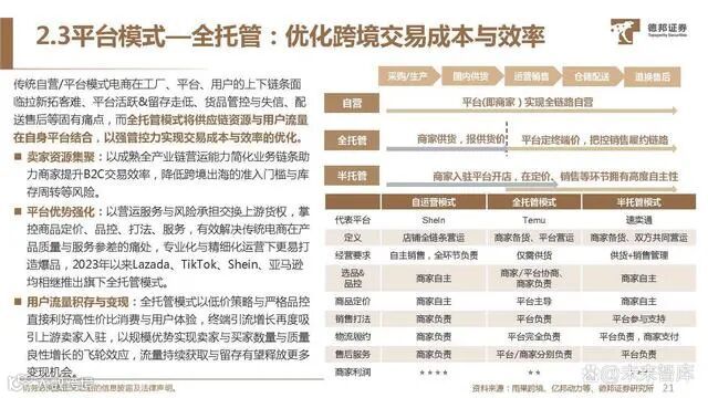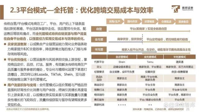 传统自营/平台模式电商在工厂、平台、用户的上下链条面 临拉新拓客难、平台活跃&留存走低、货品管控与失信、配 送售后等固有痛点,而全托管模式将供应链资源与用户流量 在自身平台结合,以强管控力实现交易成本与效率的优化。卖家资源集聚:以成熟全产业链营运能力简化业务链条助 力商家提升B2C交易效率,降低跨境出海的准入门槛与库 存周转等风险。平台优势强化:以营运服务与风险承担交换上游货权,掌 控商品定价、品控、打法、服务,有效解决传统电商在产 品质量与服务参差的痛处,专业化与精细化运营下更易打 造爆品,2023年以来Lazada、TikTok、Shein、亚马逊 均相继推出旗下全托管模式。用户流量积存与变现:全托管模式以低价策略与严格品控 直接利好高性价比消费与用户体验,终端引流增长再度吸 引上游卖家入驻,以规模优势实现卖家与买家数量与质量 良性增长的飞轮效应,流量持续获取与留存有望释放更多 变现机会。