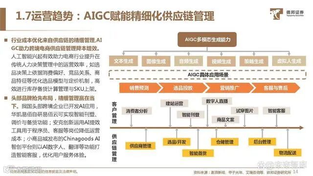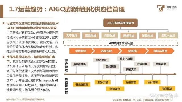 行业成本优化来自供应链的精细管理,AI GC助力跨境电商供应链管理降本增效。人工智能兴起有效助力电商行业提升在 传统人力决策管理中的运营效率,如选 品决策上依据消费偏好、竞品关系、商 品特征等优化选品模型与定价机制,高 效进行库存备货计算管理与SKU上架。头部品牌抢先布局,精细管理赢在当 下。我国头部跨境企业已开发AI应用, 华凯易佰自研易佰云可实现智能刊登、 调价与备货功能;安克创新运用AI提效 工具用于程序员、客服等岗位降低运营 成本;小商品城发布的Chinagoods AI 智创平台则以AI数字人、翻译等功能打 造智能客服,优化用户服务体验。