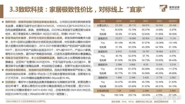 致欧科技:极致供应链打造精品家居出海龙头。公司定位全球互联网家居领 先品牌,依靠亚马逊平台打造SONGMICS、VASAGLE及FEANDREA三大 自有品牌覆盖家居、家具、宠物等品类。2023年以来受益于运费回落与成本 优化,前三季度实收入/净利润41.4亿元/2.9亿元,同增0.4%/67.1%。