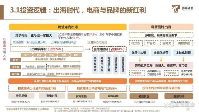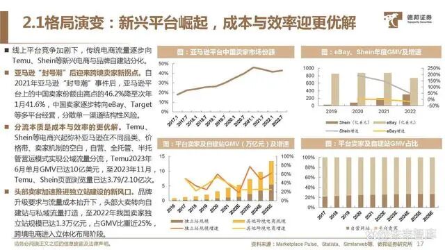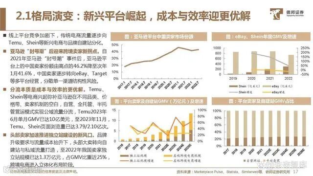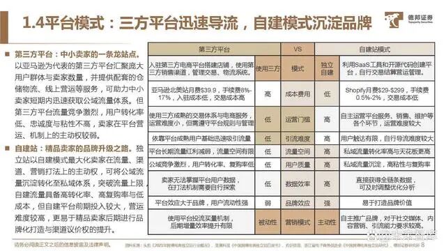 第三方平台:中小卖家的一条龙站点。以亚马逊为代表的第三方平台汇聚庞大 用户群体与卖家数量,并提供配套的仓 储物流、线上营运等服务,可助力中小 卖家短期内迅速获取公域流量体系。但 第三方平台流量竞争激烈,用户转化率 低、忠诚度与粘性不高,卖家在平台营 运、机制上的主动权较弱。自建站:精品卖家的品牌升级之路。独 立站以自建模式最大化卖家在流量、渠 道、营销打法上的主动权,可将公域流 量沉淀转化至私域体系,突破流量上限, 自建流量具备高转化率、高复购率与低 成本,但自建平台前期投入较大,营运 难度较高,更易于精品卖家后期进行品 牌化打造与渠道议价权的提升。