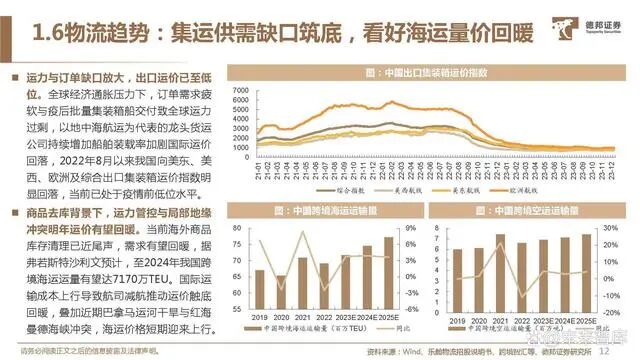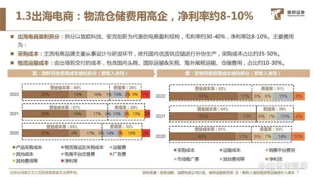 出海电商盈利拆分:拆分以致欧科技、安克创新为代表的电商盈利结构,毛利率约30-40%,净利率达8-10%。主要费用 为:采购成本:主流电商品牌主要从事设计与研发环节,依托国内优质供应链进行外协生产,采购成本占比约35-50%。物流运输成本:由出场到交付的成本,包含国内头程、国际运输&关税、海外尾程运输、仓储费用,占比约10-30%。