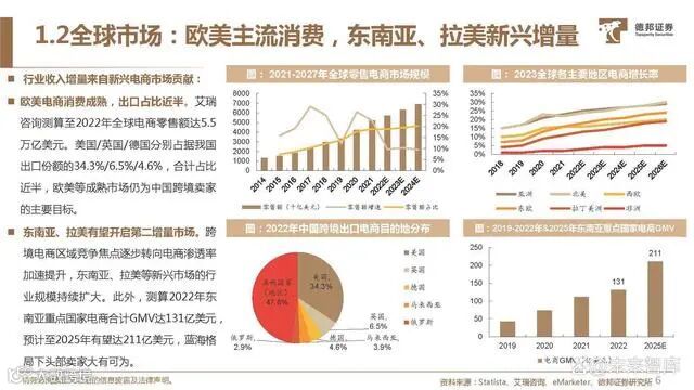 北美电商CR5高度集中,亚马逊独占38%。从跨境平台竞争格局来看,2022年北美电 商平台CR6市占率达55.7%,格局高度集 中,其中亚马逊平台占比达37.8%(2022 全球电商零售额达5.3万亿美元),远超行 业其他卖家,同期沃尔玛、Apple、eBay、 Target 等 前 五 大 平 台 市 占 率 达 6.3%/3.9%/3.5%/ 2.1%。占中国B2C卖家份额44%,GMV破2000 亿美元。亚马逊是全球领先的电子商务平 台,以其庞大的用户群和高流量而闻名。至2022年我国跨境电商B2C渠道结构中亚 马逊平台的份额占比达43%,远超其他同 业,亚马逊由中国卖家产生的GMV体量达 2006 亿美元 , 预 计 于 2026 年有望以 14.1%的CAGR成长至3396亿美元。
