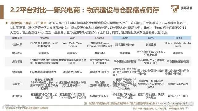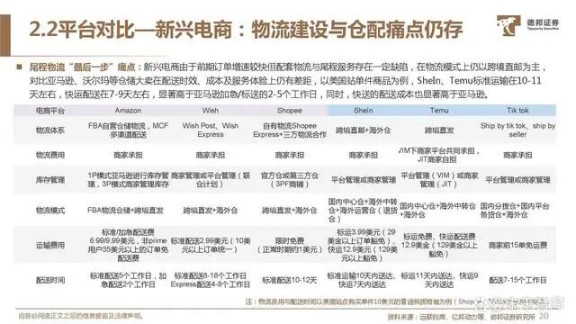 严控全链路,精品模式延续。SHEIN已通过前期服装业务建立完整的柔性供应链体系与敏捷的打法,其全托管模式是自营+平 台模式的业务延伸,高度注重商家品类对平台品类的融合补充。对比AliExpress、Temu、Tiktok等托管模式,SHEIN在供应链 打法上更为严格,与自营模式贴合度更接近。仅由商家供货备货,SHEIN独自进行选品并承担运营风险,对于零售定价权更为 强势。对于商家而言,SHEIN全托管模式入驻零费用可进入全球多个国家与地区的业务范围,用户基础与流量稳固,海外成熟 的物流与供应链体系下,卖家发货与回款结算机制稳定,卓越订单管理与体系化运营能力更适宜卖家高质量发展。
