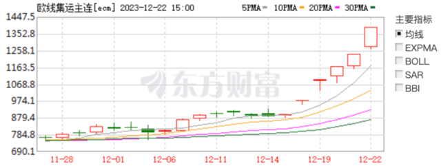 这带动国内集运指数、市场运价持续走高。集运指数(欧线)期货主力合约连续5个交易日均触及涨停,一周累计涨幅超过50%。