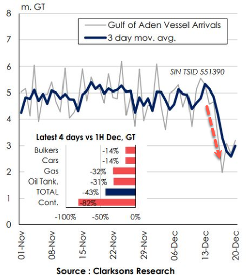 根据克拉克森研究(Clarkson Research Services)的最新数据,与本月上半月相比,过去四天抵达亚丁湾的集装箱船总吨位骤降了82%。