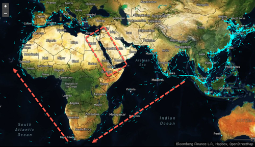 很多开往欧亚的商船放弃红海-苏伊士航线,改道好望角。物流公司 Kuehne + Nagel International AG在本周三曾发布报告称,至少有100艘集装箱船在好望角附近改道;本周末,改道的船只数量会更多。