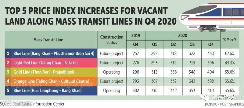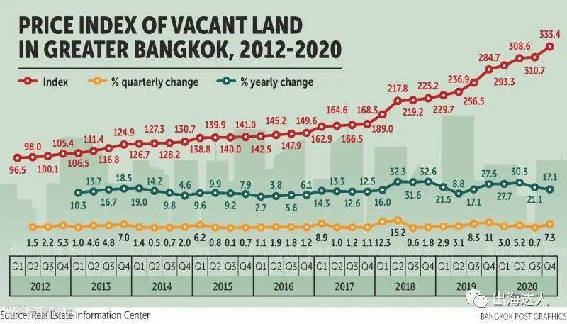 泰国首都曼谷一直是泰国最大的房地产交易市场,2020年全年曼谷的土地价格逆势上扬,大曼谷地区全年土地价格上涨17.1%,其中市中心土地价格保持不变,最贵的地段分别是Ploenchit-Lumpini地区每平方哇390万泰铢(1平方哇=4平方米),Sukhumvit核心区的土地为280万泰铢每平方哇,Silom-Sathorn地区则为170万泰铢每平方哇。土地价格的整体上涨主要还是来源于市郊新轨道交通沿线的地区。其中未来要通车的蓝色线Bang Khae-Phutthamonthon段土地价格涨幅最大全年上涨67.6%