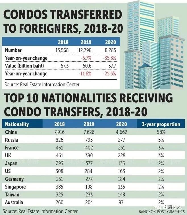 今年2月初泰国房地产信息中心REIC公布了2020年泰国全国房地产交易数据,2020年泰国全国新房和二手房交易数量为358496套,比2019年下降了8.5%,总交易金额9283.7亿泰铢,交易金额仅比2019年下降了0.3%,房屋交易均价上涨了8.96%,总价低于300万泰铢的房子占到总交易数量的79%,公寓交易总数为121838套占总交易数量的33.99%,其中外国人购买的公寓数量仅为8285套占到所有公寓交易量的6.8%,交易数量和占比均为近5年新低(2018年最高,为13568套占比10.1%),交易总金额为506亿泰铢比2019年的历史峰值下降了25.5%,中国买家的购买的公寓数量下降到4662套比2018年的峰值下降了41.1%。综合来看2020年泰国房产交易总量下降但房屋交易均价上涨,外国买家在房屋交易中的占比明显下降,根据REIC的预测2021年房屋交易总量会继续下降1.5%,如果全球疫情得到控制随之外国游客的到来,外国买家数量会有所回升对房地产市场会有提振作用。