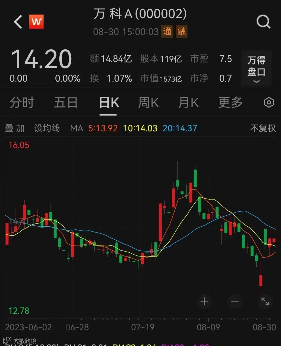 截至8月30日,万科股价为14.2元/股,而其截至年中的每股净资产则为21.44元/股。