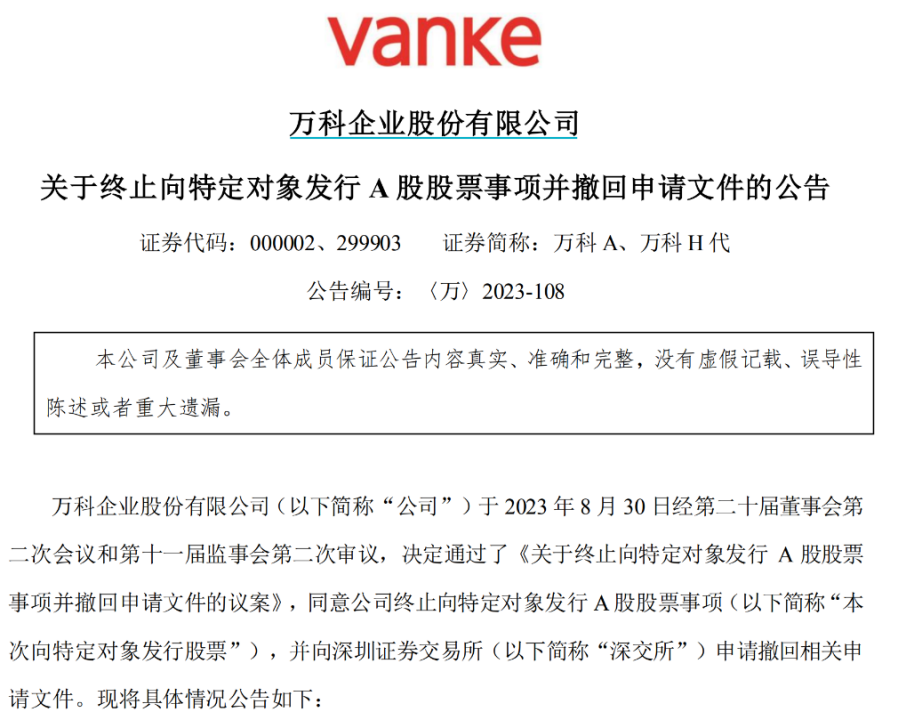 公告显示,万科董事会审议通过了《关于终止向特定对象发行A股股票事项并撤回申请文件的议案》,同意公司终止向特定对象发行A股股票事项,并向深交所申请撤回相关申请文件。