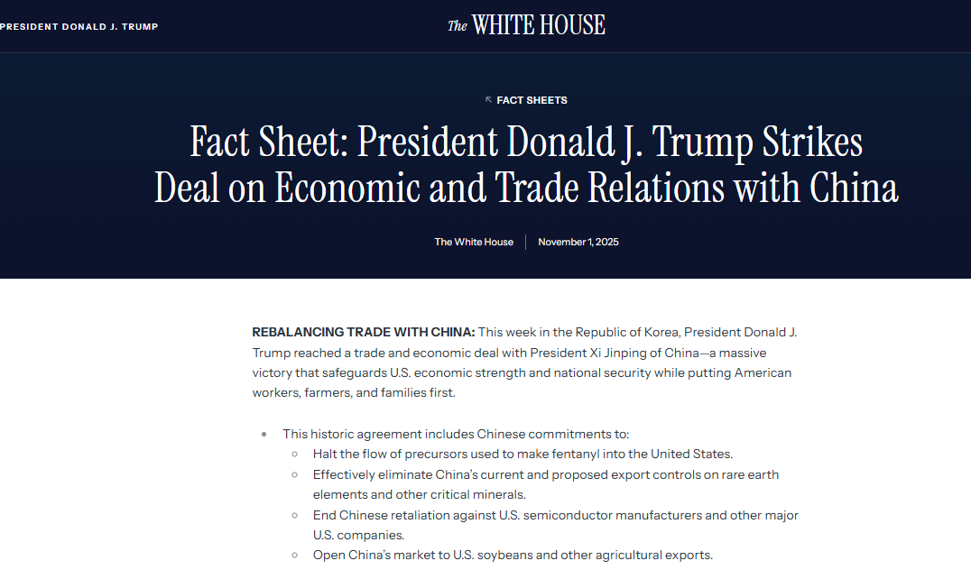 当地时间 2025 年 11 月 1 日,美国政府在白宫官网正式发布针对中国贸易政策的调整变化。